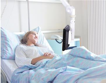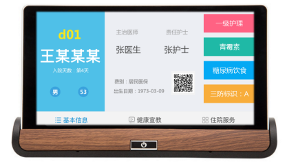 患者可通過桌牌或平板了解自身當(dāng)前病情狀態(tài),費(fèi)用查詢并完成在線支付;可以查看多媒體宣教學(xué)習(xí)相關(guān)病理知識(shí),盡量配合醫(yī)護(hù)工作;查看醫(yī)院最新動(dòng)態(tài)消息,如某某專甲今日在我院出診等等;可以訂餐,通過與醫(yī)院食堂對(duì)接數(shù)據(jù)完成訂餐操作。還有院內(nèi)陪護(hù)申請(qǐng),物品申請(qǐng)等多種功能模塊