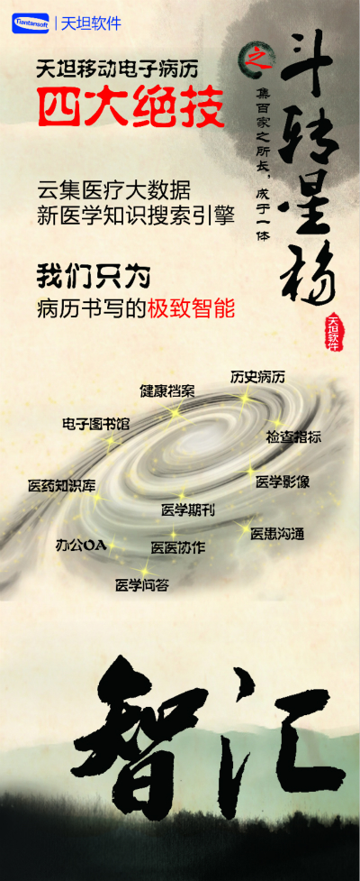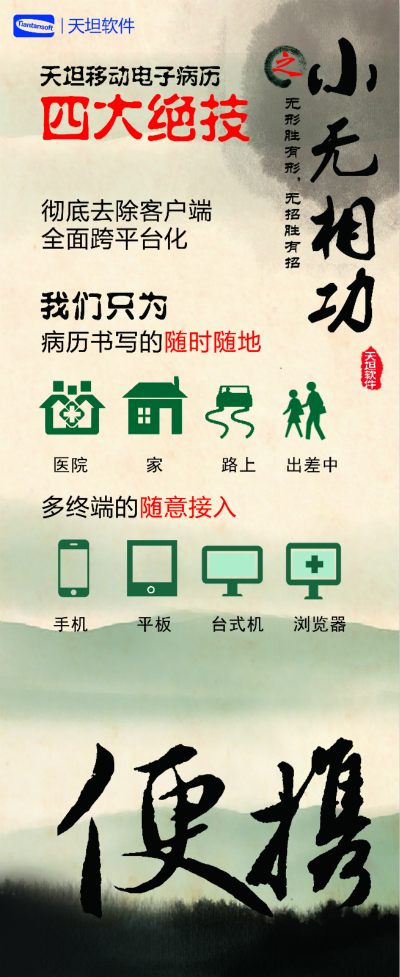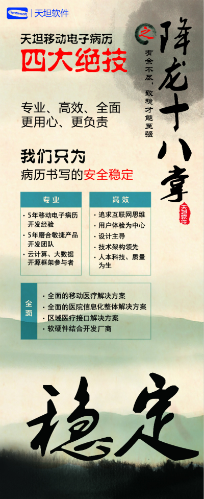 天坦軟件,作為國(guó)內(nèi)移動(dòng)電子病歷的先行者,盛裝亮相京交會(huì)。在會(huì)上展示了以“天坦移動(dòng)電子病歷”為核心的醫(yī)院整體信息化系統(tǒng),受到眾多參觀(guān)者的關(guān)注。天坦軟件始終堅(jiān)持以“讓天下沒(méi)有難看的病”為宗旨,致力于醫(yī)療事業(yè)發(fā)展。為中國(guó)醫(yī)療衛(wèi)生行業(yè)的信息化建設(shè)以及個(gè)人健康服務(wù)提供從硬件到軟件、從技術(shù)到服務(wù)的全面解決方案,是中國(guó)醫(yī)療信息化市場(chǎng)中快速成長(zhǎng)的獨(dú)立軟件廠(chǎng)商之一。數(shù)年來(lái),一直堅(jiān)持研發(fā)以移動(dòng)電子病歷為核心的醫(yī)院信息化系統(tǒng),從移動(dòng)框架的病歷編輯器到跨平臺(tái)的移動(dòng)醫(yī)療解決方案,為整個(gè)病歷信息化行業(yè)注入了極強(qiáng)的創(chuàng)新活力。 “天坦移動(dòng)電子病歷”為核心的醫(yī)院整體信息化系統(tǒng)秉承“高效應(yīng)用、信息互通”的基本理念,是專(zhuān)門(mén)為醫(yī)院設(shè)計(jì)開(kāi)發(fā)的醫(yī)療信息化系統(tǒng)的核心組成部分。具有高效、安全、穩(wěn)定、易用、移動(dòng)、智能等特點(diǎn),除此之外,還具有穩(wěn)定、完全跨平臺(tái)運(yùn)行、功能強(qiáng)大、系統(tǒng)性能卓越等巨大優(yōu)勢(shì)。