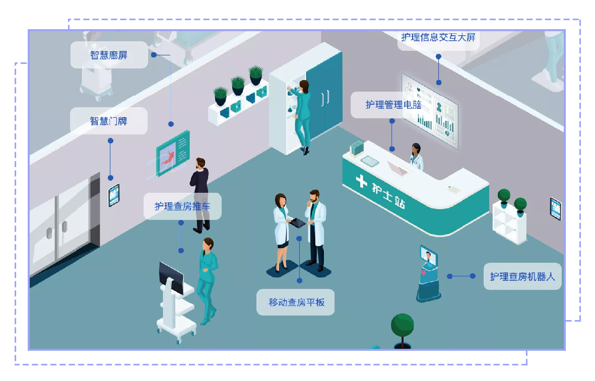 目前,根據(jù)湖南省腫瘤醫(yī)院智慧病房建設(shè)項(xiàng)目需求及場(chǎng)地條件,基于院內(nèi)智能應(yīng)用場(chǎng)景將布局結(jié)構(gòu)劃分為:護(hù)士站、醫(yī)生辦公室、病房走廊、病房?jī)?nèi)部,每個(gè)區(qū)域配備智能信息化設(shè)備。