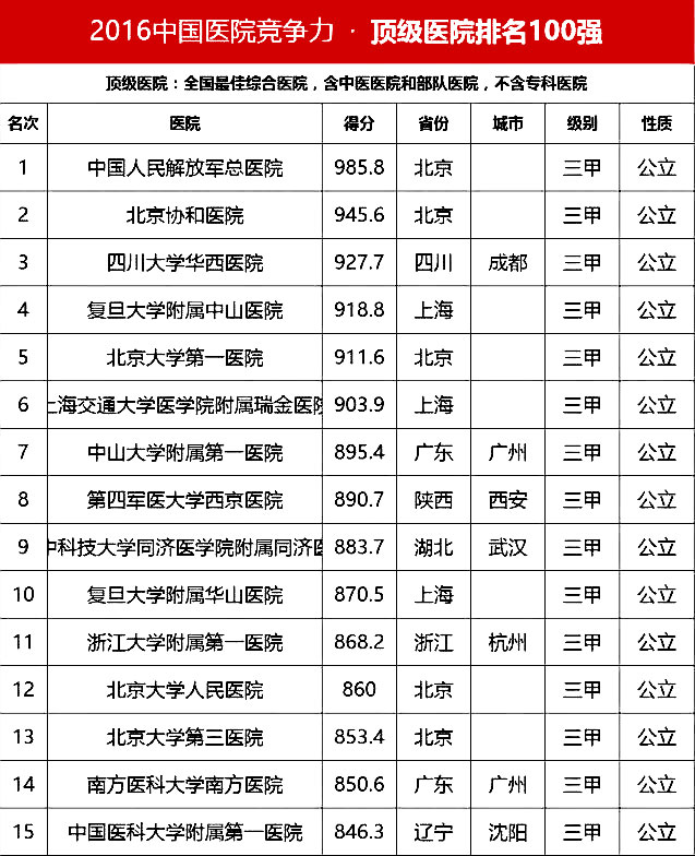 “頂級醫(yī)院100強”采用的排名指標體系包括四個方面:醫(yī)院最優(yōu)規(guī)模(實開床位數(shù)、年門急診量、年出院量、全院人數(shù));醫(yī)療技術(正高職稱人數(shù)/全院人數(shù)、全院醫(yī)師人數(shù)/實開床位數(shù)、醫(yī)療設備資產(chǎn)/總資產(chǎn)、年住院手術量/年出院量、國家級衛(wèi)紀委臨床重點專科/總??茣CU床占比);醫(yī)院運行(平均住院天數(shù)、床位使用率、門診均次費用/當?shù)厝司鵊DP、住院均次費用/當?shù)厝司鵊DP、外省住院病人占比);學術影響力(院士人數(shù)、學術領袖占比、教育部重點學科及重點實驗室/總??茢?shù)、本年度獲國家自然科學基金項目數(shù)量和總全額)。