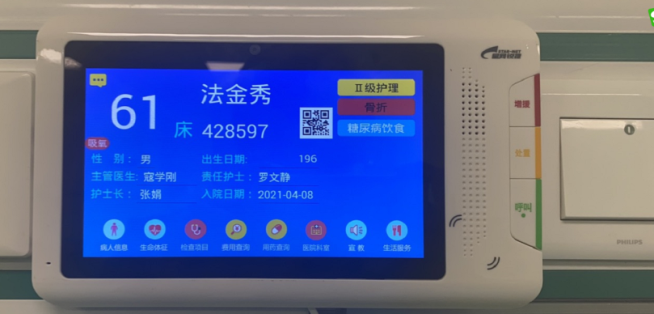 入住科室的第一天,護(hù)士會對患者進(jìn)行“入院宣教”,除了正常的住院注意事項(xiàng)外,還專門指導(dǎo)患者學(xué)會了病床上方患者端的“ 智能電子床頭屏”,它是患者住院期間的信息小助手,通過它不僅可以查詢患者的體征數(shù)據(jù)、護(hù)理事項(xiàng)、住院費(fèi)用、檢查項(xiàng)目預(yù)約情況、住院及治療須知等豐富信息,還可以提供點(diǎn)餐、醫(yī)療服務(wù)評價(jià)等服務(wù)。