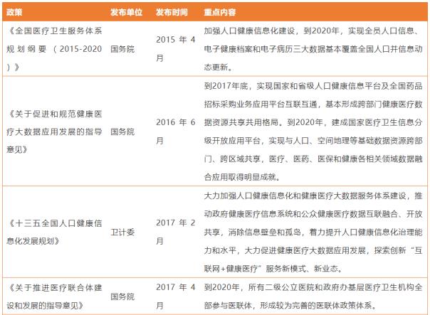 事實上,自2015年4月,國務(wù)院發(fā)布《全國醫(yī)療衛(wèi)生服務(wù)體系規(guī)劃綱要(2015-2020)》,提出加強(qiáng)人口健康信息化建設(shè),到2020年,實現(xiàn)全員人口信息、電子健康檔案和電子病歷三大數(shù)據(jù)基本覆蓋全國人口并信息動態(tài)更新,我國陸續(xù)出臺了一系列加速醫(yī)療信息化產(chǎn)業(yè)發(fā)展的政策。