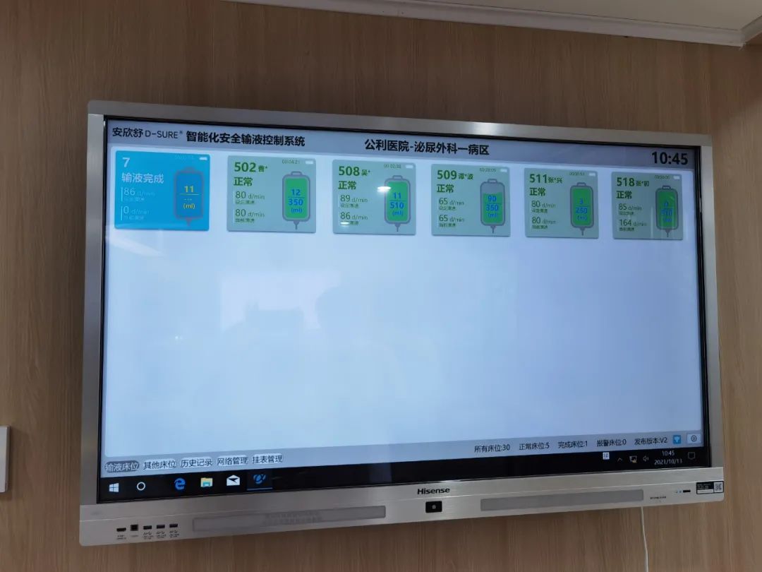 確定了用哪種輸液監(jiān)控技術(shù),變成“智慧輸液”卻還需要一個(gè)信息化工程,這就是信息護(hù)士產(chǎn)生的原因。以智慧輸液為例,要讓輸液信息“跑”起來,就要一張“網(wǎng)”——具象地看就是智慧病房的7個(gè)屏:病床有兩個(gè)屏,大屏功能很多,不但可以看視頻、叫護(hù)士……還可以完成出院結(jié)算;小屏就是以前床頭的“小白卡”,顯示患者姓名、護(hù)理級(jí)別等。護(hù)士站有三個(gè)屏,一個(gè)大屏是輸液控制屏,顯示全病區(qū)的輸液情況;另外一個(gè)大屏相當(dāng)于寫字板,就是護(hù)士站常見的手寫黑板的“升級(jí)版”,除了即時(shí)更新醫(yī)囑外,還可以在病房看到正在做的手術(shù)情況等;此外還有護(hù)士站管理屏。再加上走廊屏、房間屏,所有的信息一次輸入、全程“跑動(dòng)”。